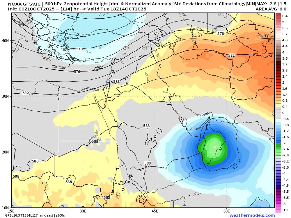 راصد ويذر - تشير التوقعات بعد أمر الله تعالى الى تأثر سلطنة عمان و الامارات بموجة علوية شرقية باردة ترافقها كتلة هوائية رطبة و دافئة ستساهم بحدوث حالة من عدم الاستقرار الجوي الممطرة خريفية الطابع تتمثل بنشاط خلايا رعدية ممطرة تحمل أمطار متفاوتة الغزارة قد تصحب بالبرد و عواصف رعدية احيانا ساعات النهار و الليل اعتباراً من اليوم الجمعة و تشتد يومي السبت و الاحد و تستمر لغاية يوم الاثنين في السواحل الشمالية من سلطنة عمان و سلسلة جبال حجر الحجر الشمالي و مسندم و خصب و محضه تمتد و تطال المناطق الساحلية من شرق الامارات الفجيرة خورفكان دبا كلباء حتا و كما تمتد و تطال مرتفعات الجبلية و الوسطى من الامارات و لايستبعد ان تطال رأس الخيمة و اجزاء من الامارات الشمالية