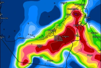 الخلايا الرعدية الممطرة يتوقع ان تنشط فترات بعد الظهيرة و تستمر حتى ساعات الليل الاولى من يوم الاثنين حيث تتجدد بنفس الوتيرة يوم الثلاثاء القادم ، حيث ستكون متفرقة .